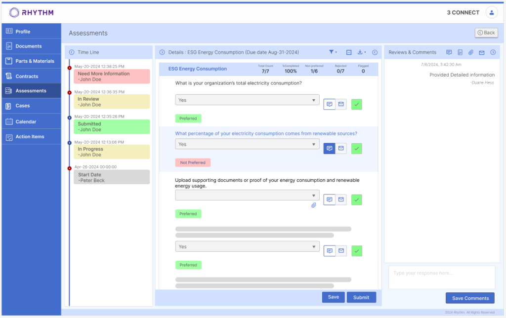 Through real-time analytics and monitoring tools, Rhythm enables businesses to assess supplier risk profiles, identify potential vulnerabilities, and implement mitigation strategies. Our platform facilitates seamless communication and collaboration between buyers and suppliers, promoting trust, transparency, and mutual accountability. Rhythm Innovations helps organizations navigate regulatory complexities with ease, safeguarding against potential legal and reputational risks. With Rhythm Innovations, businesses can fortify their supply chains, drive operational excellence, and stay ahead in today’s competitive marketplace.
